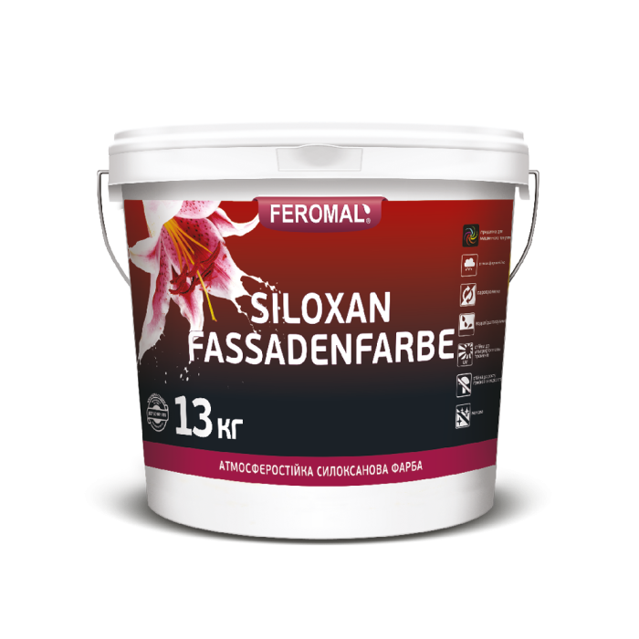 FEROMAL 75 SILOXAN FASSADENFARBE — високопаропроникна, стійка до забруднення та ультрафіолетових променів, водовідштовхувальна фасадна фарба. Призначена для професійного декоративно-захисного пофарбування декоративних штукатурок в системах утеплення в т.ч. з використанням мінераловатних та пінополістирольних плит, а також попередньо підготованих мінеральних поверхонь (бетон, цегла, цементні, цементно-вапняні штукатурки та шпаклівки). Придатна для відновлення старих поверхонь акрилових і силіконмодифікованих штукатурок та фарб з високою несучою здатністю. Володіє високими адгезією до основи, покривною здатністю, стійкістю до змивання. Забезпечує довготривалий захист фасаду від росту грибків та водоростей. Тонується за каталогами NCS, RAL, Feromal Color System та інших. Для зовнішніх робіт.